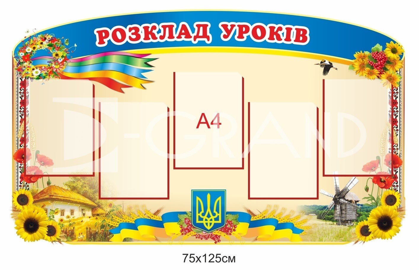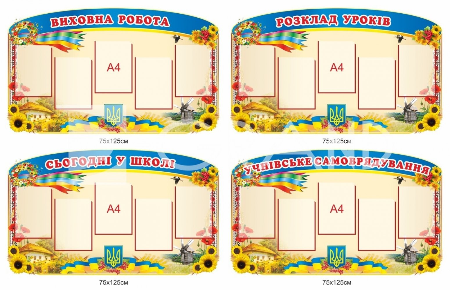 Набір шкільних стендів: Виховна робота, Розклад уроків, Сьогодні у школі, Учнівське самоврядування