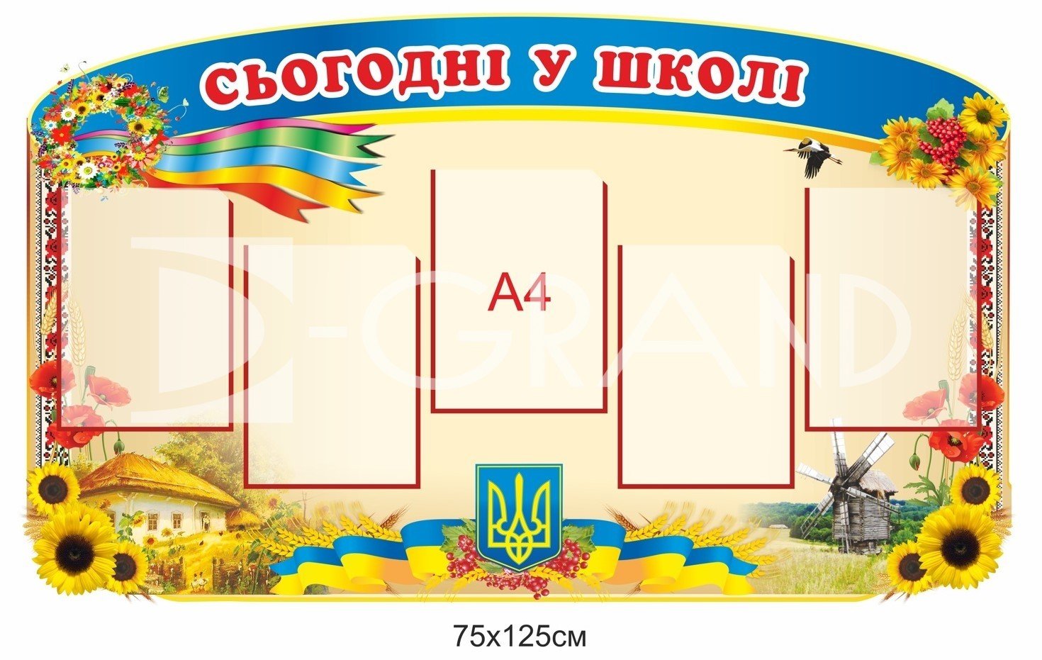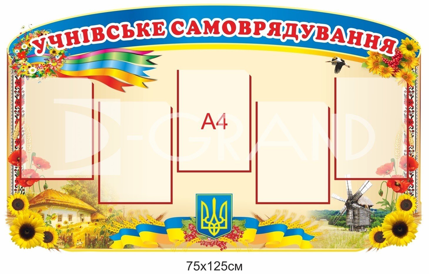 Дизайн стендів виконано у національному стилі: із зображеннями українського прапора, квітів, стрічок та традиційних елементів. Такий набір створює теплу атмосферу патріотизму, любові до Батьківщини та поваги до школи.