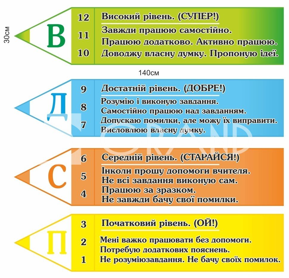 Набір стендів "Критерії оцінювання" для НУШ створений D-Grand для наочного пояснення учням принципів оцінювання їхніх знань і навичок. Кольоровий, зрозумілий дизайн із чітким поділом на рівні допомагає дітям швидко орієнтуватися у вимогах та відслідковувати власний прогрес. Стенди виготовлені з якісних матеріалів, підходять для оформлення класних куточків, тематичних зон та навчальних кабінетів початкової школи. Такий набір сприяє формуванню прозорої та доброзичливої системи оцінювання, що відповідає стандартам Нової української школи.