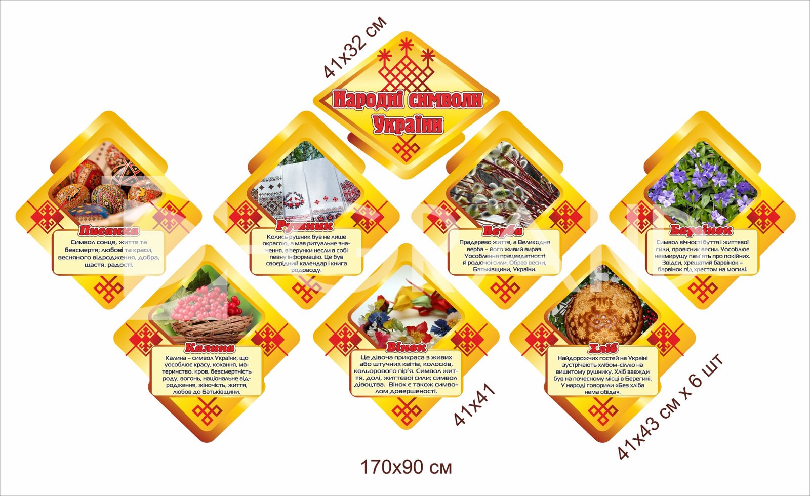 Комплект Стендів 'Народні Символи України': Розкрийте Багатогранність Культурної Спадщини за Допомогою Стендів з Образами Писанки, Рушника, Верби, Барвінка, Калини, Вінка та Хліба на D-Grand.