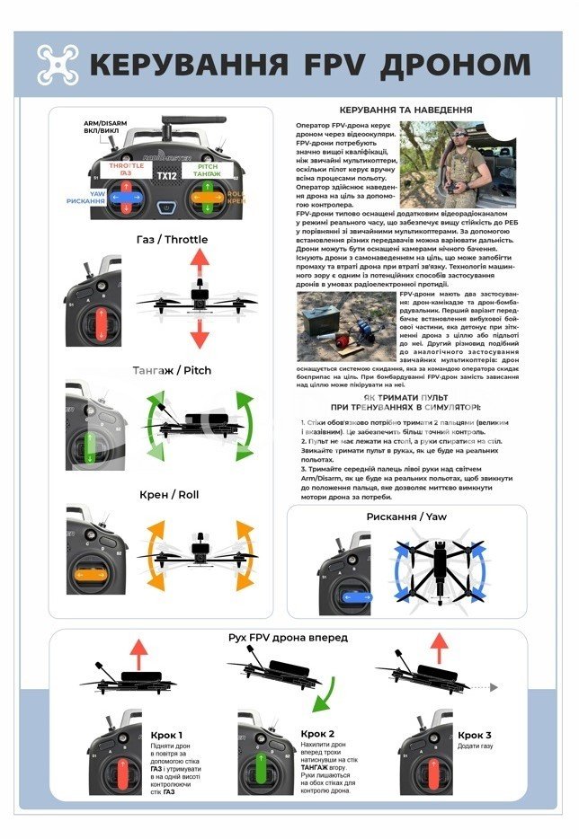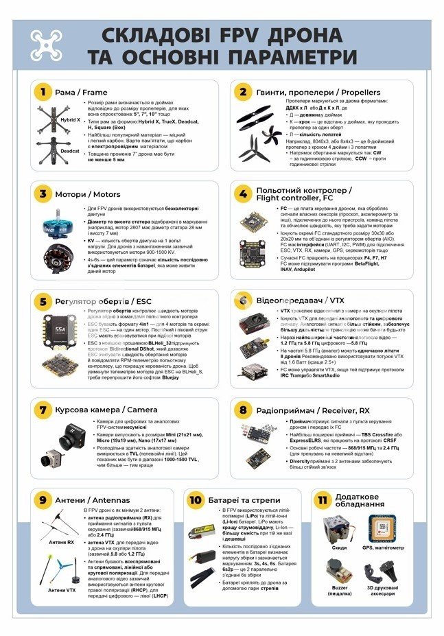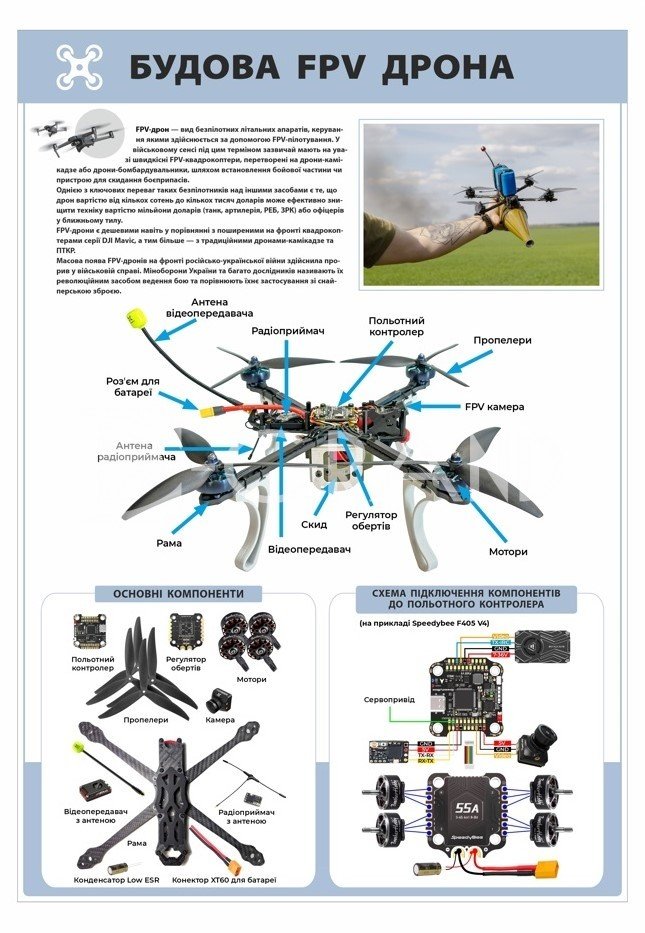 Навчальні стенди FPV дронів розроблені з урахуванням освітніх потреб осередків вивчення предмета «Захист України». Візуальні схеми, ілюстрації та зрозумілі пояснення сприяють ефективному засвоєнню матеріалу, формуванню технічного мислення та розвитку практичних навичок.