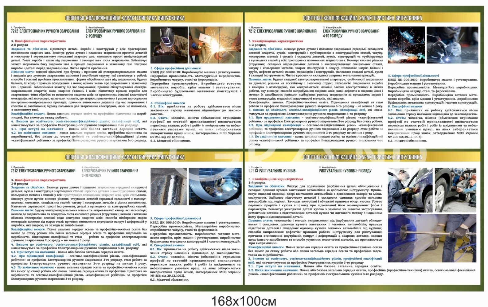 Стенд «Освітньо-кваліфікаційна характеристика електрозварника та рихтувальника» розроблений для використання у професійно-технічних навчальних закладах, майстернях, навчально-виробничих центрах і підприємствах. Матеріал на стенді містить повний обсяг інформації щодо професій електрозварника ручного зварювання (2–4 розряди) та рихтувальника кузовів 3-го розряду.