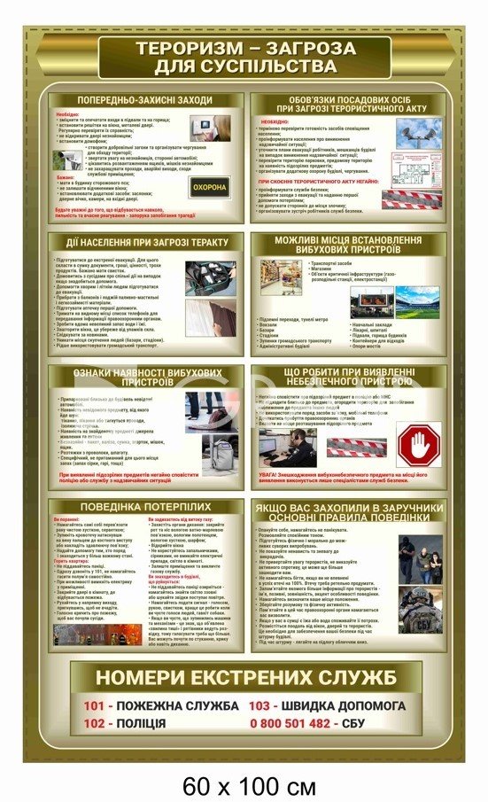 Цей плакат розроблений для підвищення пильності громадян та надання чітких інструкцій щодо збереження життя в умовах терористичної загрози. Він є необхідним елементом оформлення громадських установ, навчальних закладів та підприємств.