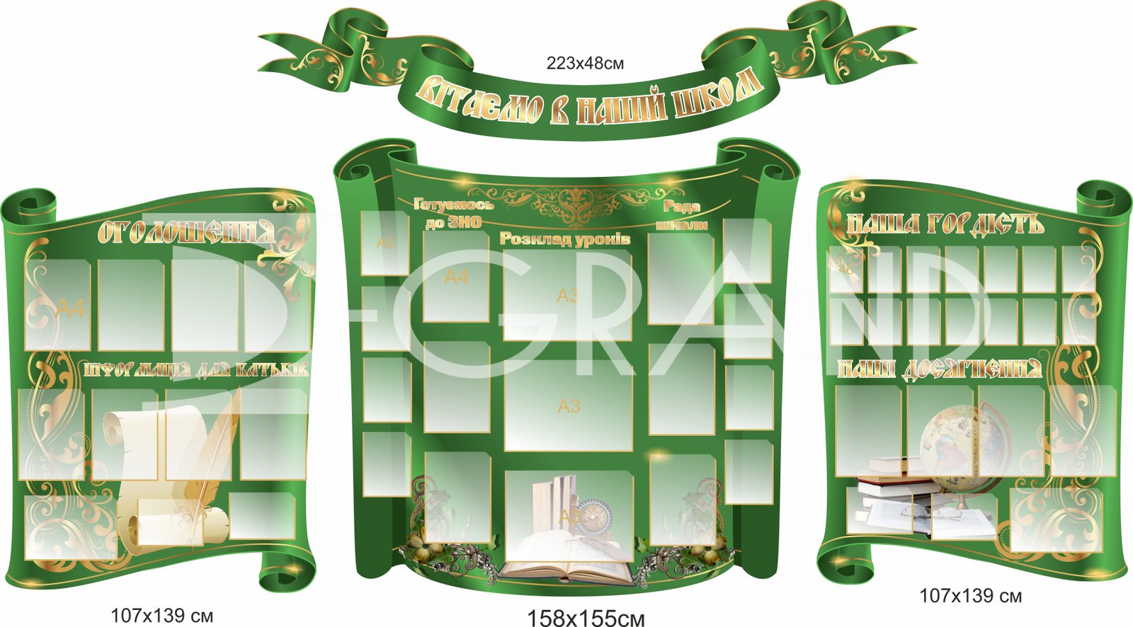 Завітайте до нашої школи та дізнайтеся більше про нашу освітню програму, активності та цінності, які ми виховуємо у наших учнів. Замовте презентаційний комплект стендів "Вітаємо в нашій школі" на сайті D-Grand прямо зараз і покажіть світлу та привітну ауру вашої школи всім, хто входить до неї.
