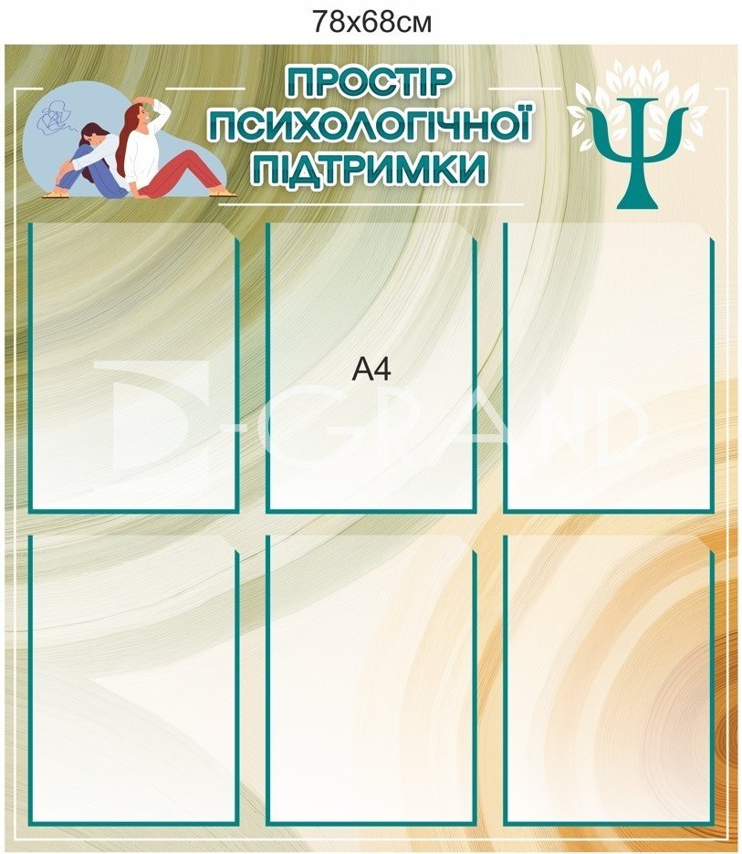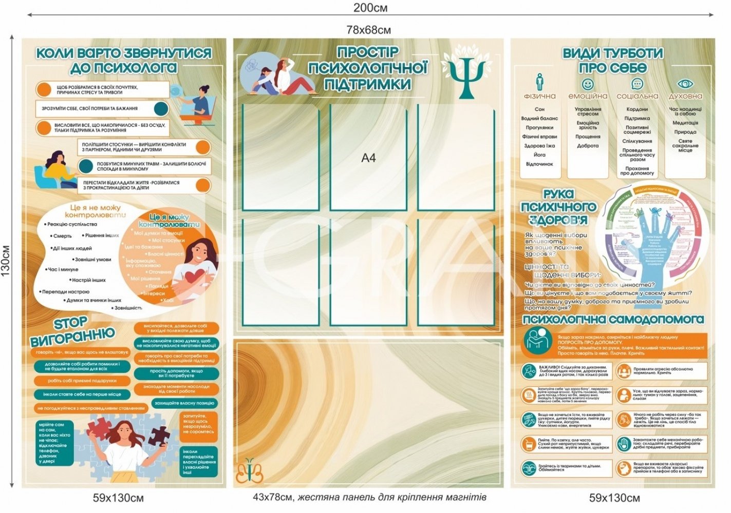 Комплект стендів «Простір психологічної підтримки» — це сучасне рішення для оформлення кабінету практичного психолога, ресурсної кімнати або інформаційної зони у закладі освіти. Дизайн створено у спокійній, гармонійній кольоровій гамі, що сприяє формуванню безпечного та довірливого середовища.
