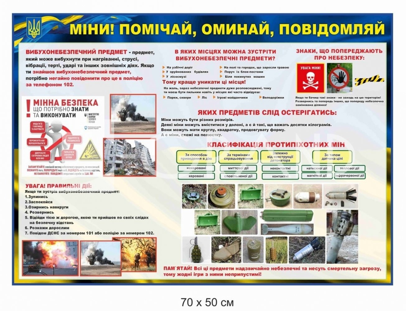 Матеріал подано доступно та наочно: текст супроводжується фотографіями, іконками та прикладами небезпечних предметів. Стенд містить рекомендації щодо правильних дій у разі виявлення підозрілого об’єкта: зупинитися, не наближатися, не торкатися, відійти на безпечну відстань та негайно повідомити відповідні служби.