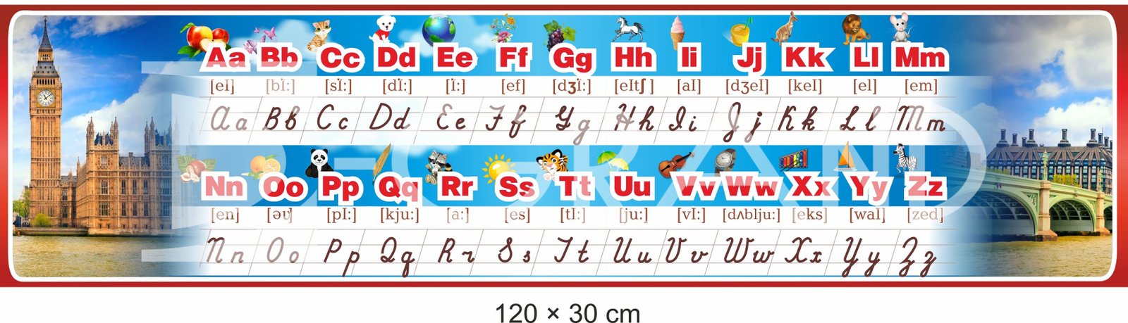 Кожна літера англійського алфавіту розміщена на стенді в чіткому та зрозумілому форматі, що допоможе учням легко запам'ятовувати та розпізнавати їх. Візуальне представлення алфавіту доповнюється ілюстраціями, які допоможуть учням асоціювати літери зі зображеннями, що розвиває їх мовленнєві та пізнавальні здібності.
