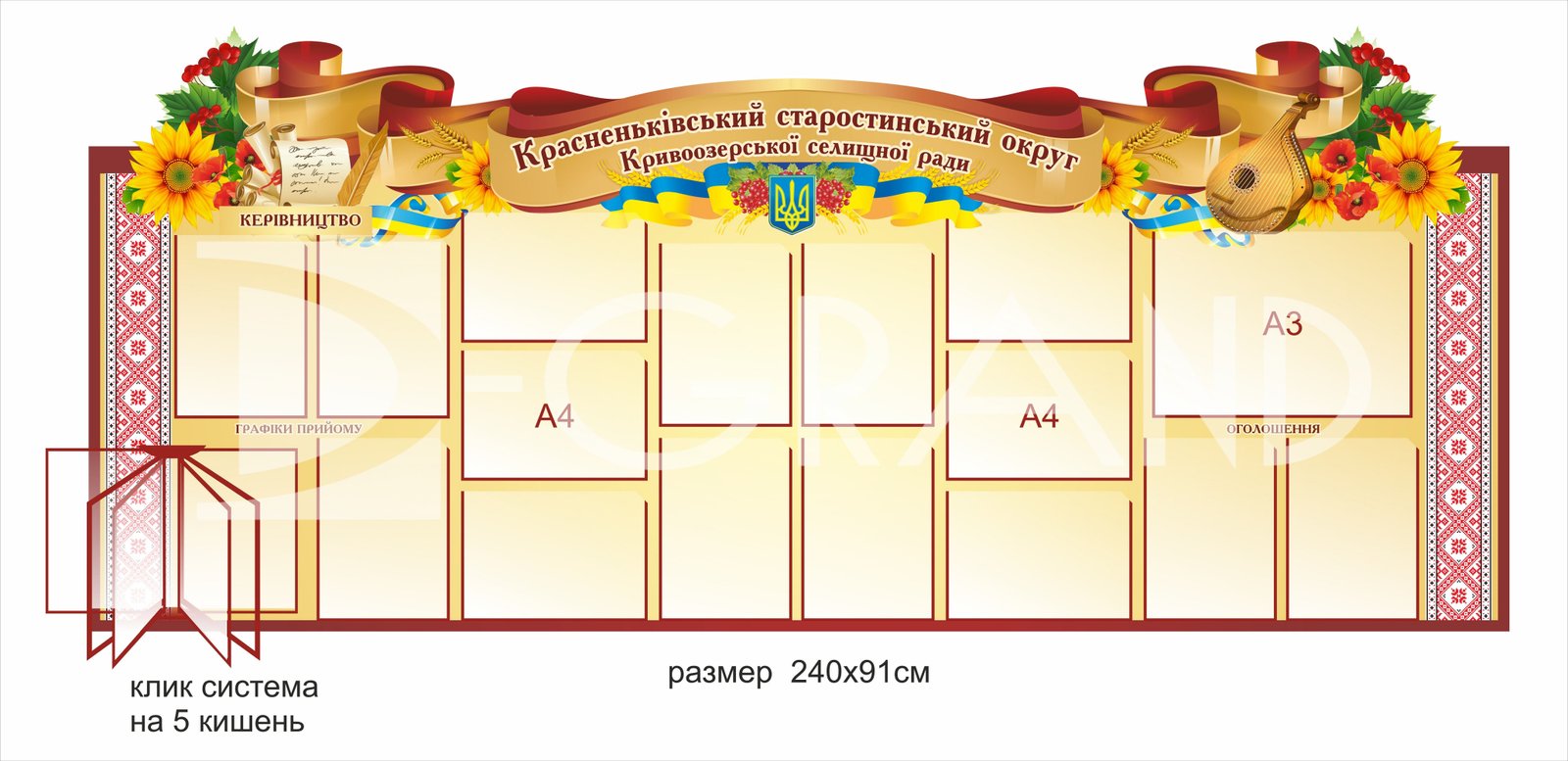 - Стенди покриваються плівкою з повнокольоровим друком.