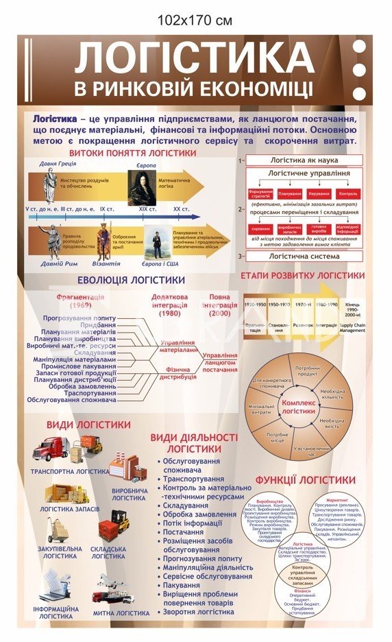 На стенді з логістики студенти зможуть знайти визначення логістики, еволюцію та етапи розвитку логістики, дізхнаються про функції та види логістики.