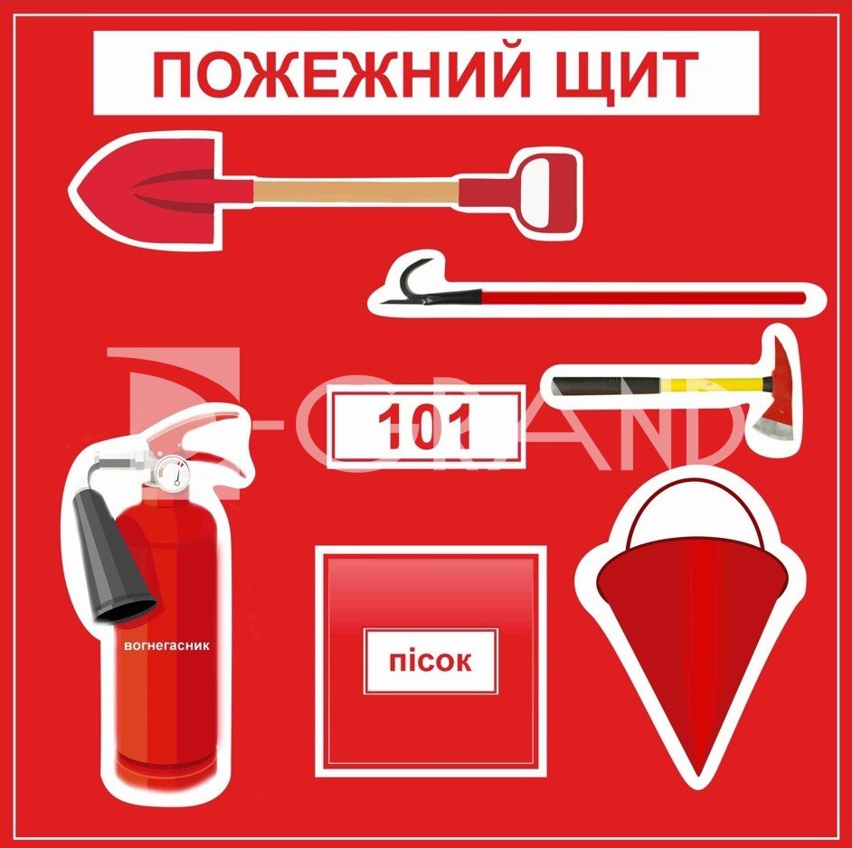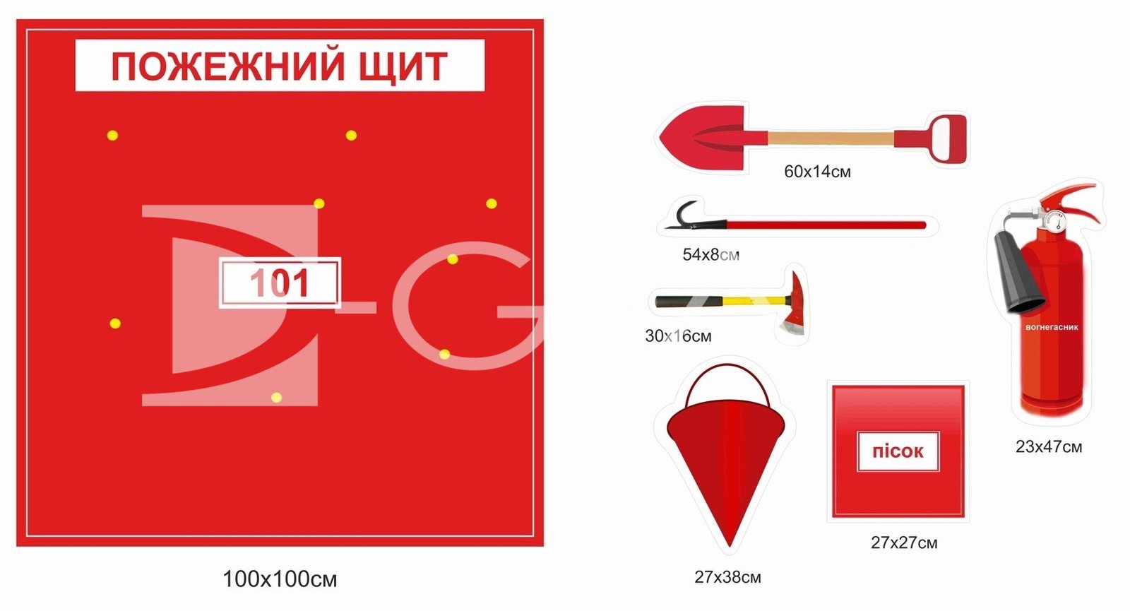 Стенд імітує реальний пожежний щит та включає окремі магнітні елементи, що відтворюють основний пожежний інвентар: лопату (60х14 см), лом (54х8 см), сокиру (30х16 см), конусне відро (27х38 см), та вогнегасник (23х47 см). Це дозволяє легко запам'ятати, що саме має бути на щиті. Магнітне кріплення дозволяє розміщувати елементи на стенді, що робить його інтерактивним та зручним для навчального процесу.