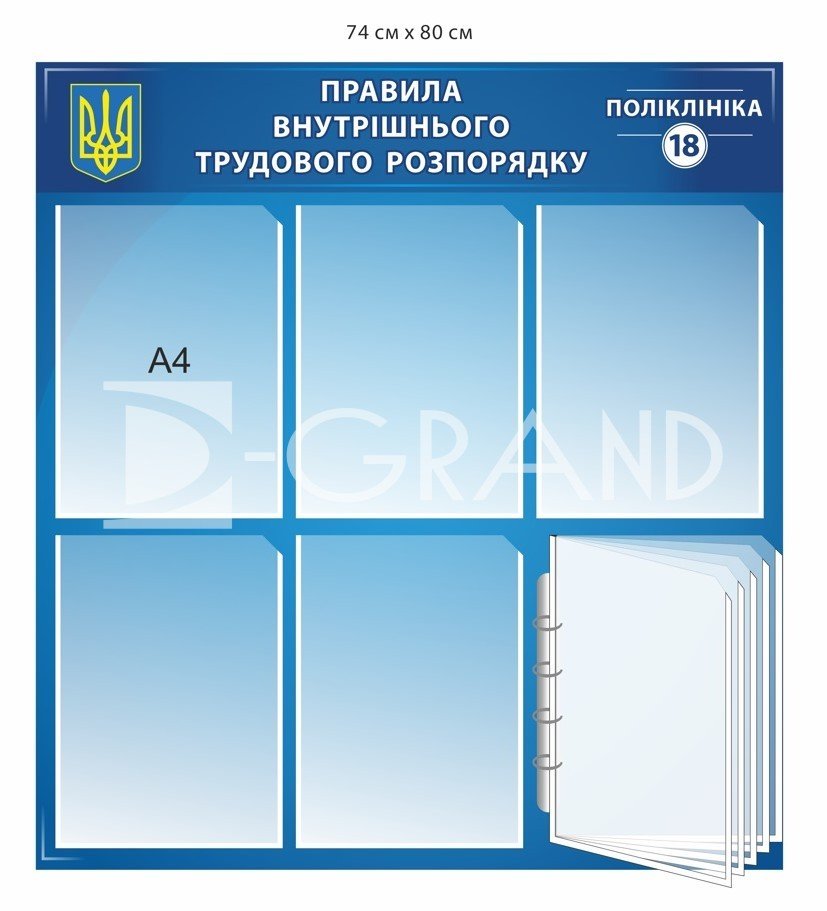 Чітке дотримання правил внутрішнього трудового розпорядку (ПВТР) є запорукою злагодженої та ефективної роботи будь-якого медичного закладу. Стенд "Правила внутрішнього трудового розпорядку" від D-GRAND — це спеціалізоване рішення для Поліклініки №18, яке допомагає донести ключову інформацію до співробітників та відвідувачів.