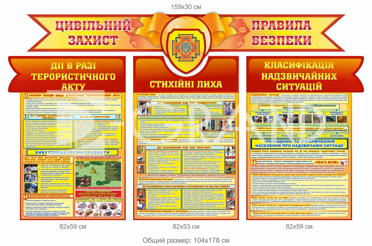 Стенд цивільного захисту та правил безпеки є важливим інструментом для поширення знань та навчання з питань безпеки та захисту в надзвичайних ситуаціях. Цей стенд надає корисну інформацію, поради та рекомендації щодо процедур евакуації, використання пожежного обладнання, правил поведінки під час надзвичайних ситуацій та загальних правил безпеки.