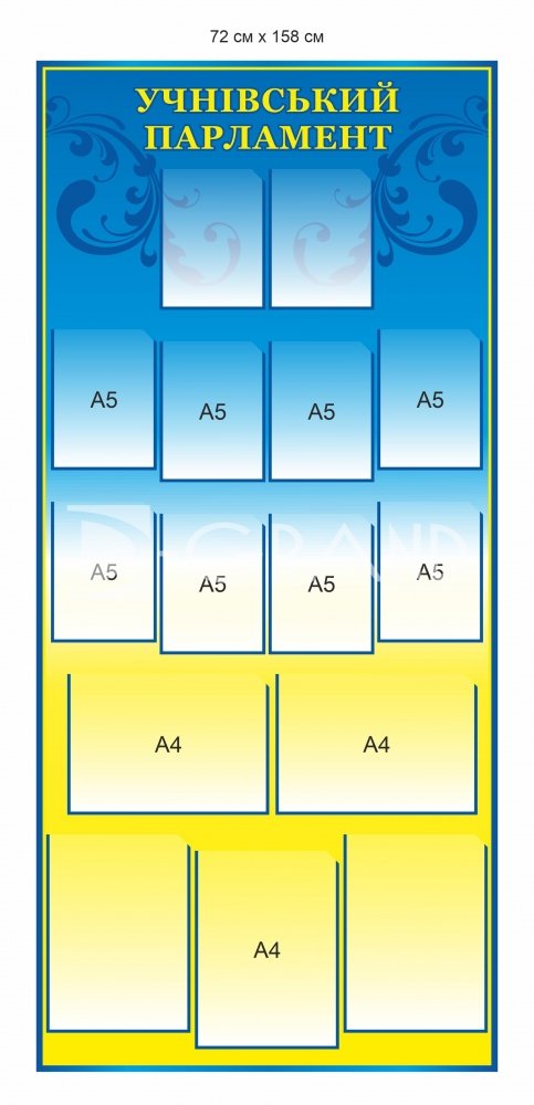 Яскравий дизайн у синьо-жовтій кольоровій гамі пасує будь-якому освітньому простору — від початкової школи до ліцею. Розмір 72 × 158 см робить стенд помітним, інформативним та зручним для розміщення в коридорі, холі чи кабінеті самоврядування.