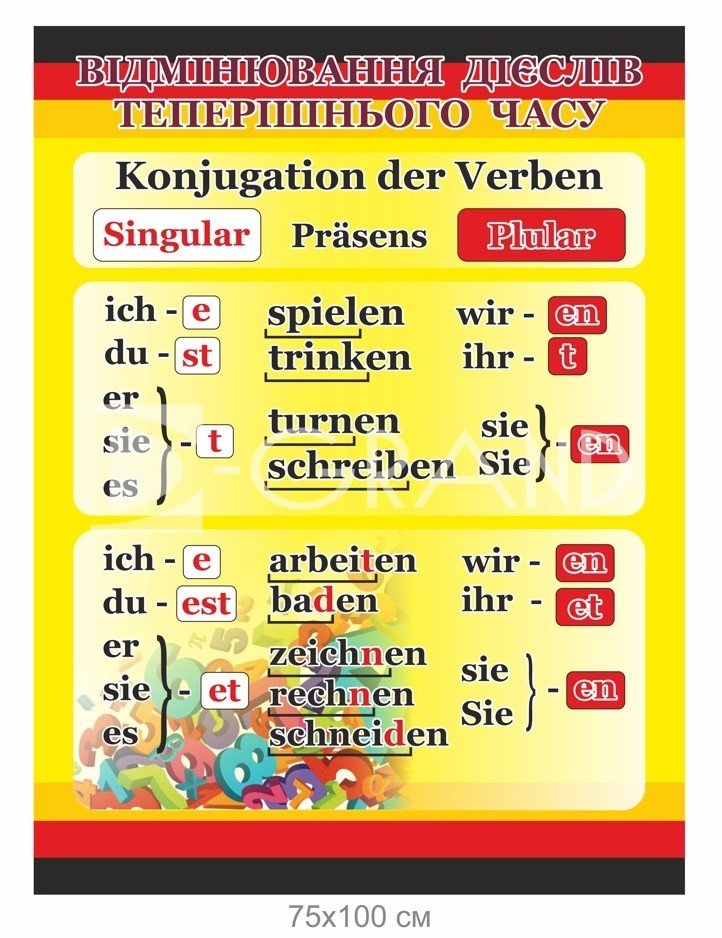 - Полегшення процесу навчання: зручно структурована інформація допомагає краще зрозуміти систему відмінювання дієслів у німецькій мові та робить навчальний процес більш цікавим та організованим.