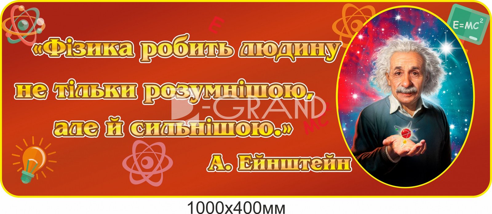 Замовте стенд з висловом з фізики Ейнштейна на D-Grand та надайте своїм учням можливість бачити, що можливості невичерпні, коли ми постійно прагнемо відкривати нове та розширювати свої знання.