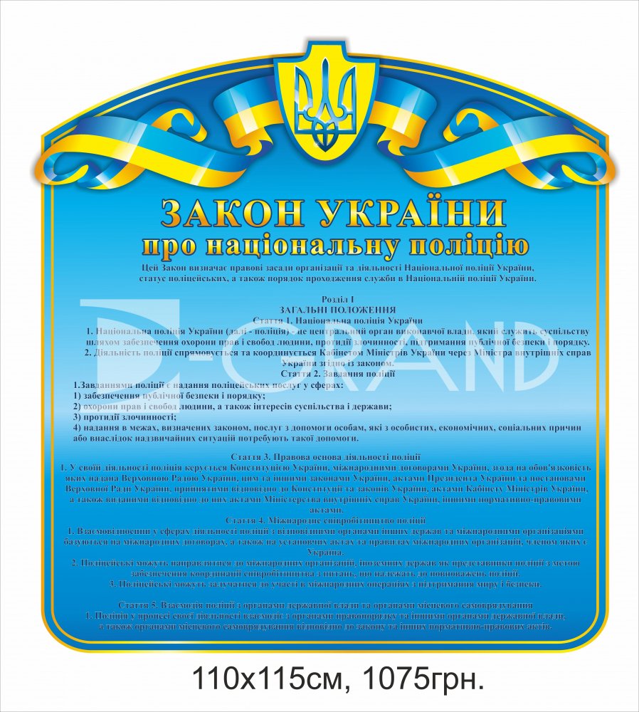 Стенд Закону України про національну поліцію від D-Grand є незамінним джерелом інформації для поліцейських відділів та установ, що працюють у сфері правоохоронної діяльності. Він виготовлений з високоякісних матеріалів, що забезпечує його міцність та довговічність. Стенд містить основні положення та норми Закону України про національну поліцію, які визначають права та обов'язки поліцейських, процедури, професійні стандарти, взаємодію з громадськістю та інше. Цей стенд допомагає забезпечити доступну та зрозумілу інформацію про законодавство поліції, що є важливим для якісного виконання службових обов'язків. Замовте стенд Закону України про національну поліцію від D-Grand та покращіть інформаційну базу вашого поліцейського відділу