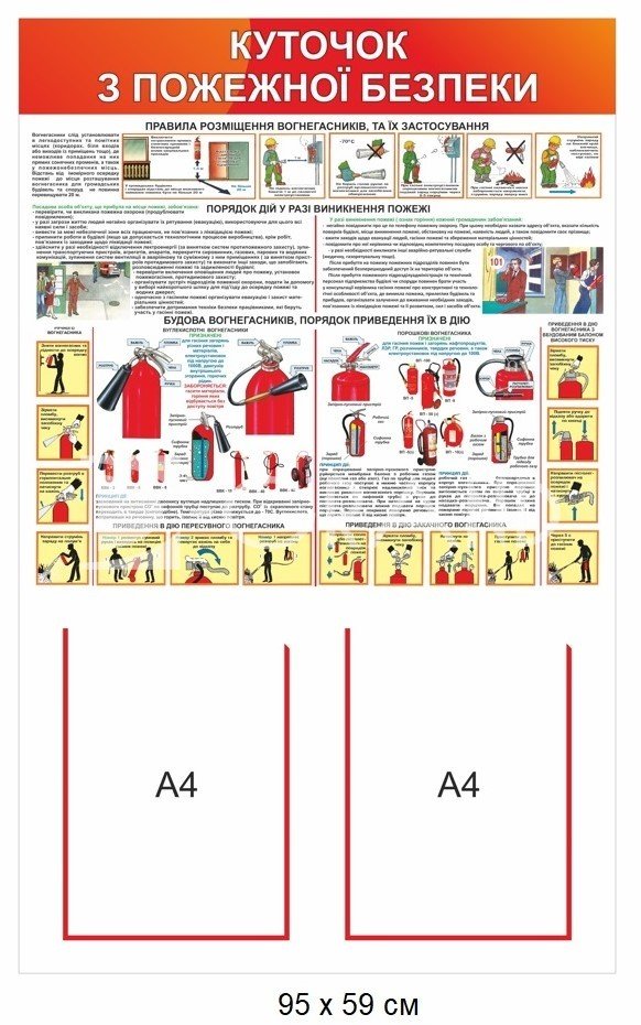 2. "Куточок з пожежної безпеки" — пояснення видів вогнегасників, порядок дій при пожежі, схема використання первинних засобів пожежогасіння, вказівки щодо розміщення інвентарю.