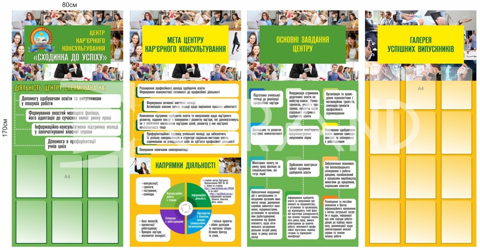 Центр кар'єрного консультування відіграє ключову роль у допомозі студентам та випускникам у плануванні та розвитку їхньої професійної кар'єри. Стенди для такого центру є важливим інформаційним ресурсом, що сприяє поширенню знань, мотивуванню та інформуванню відвідувачів про можливості, які відкриває центр. Розглянемо основні аспекти роботи центру та роль стендів у цьому процесі.,