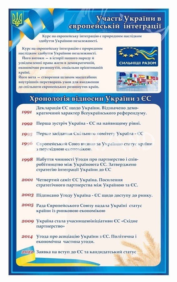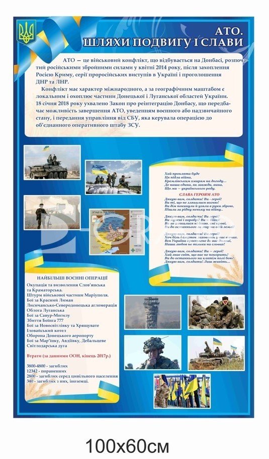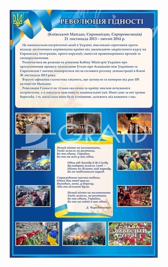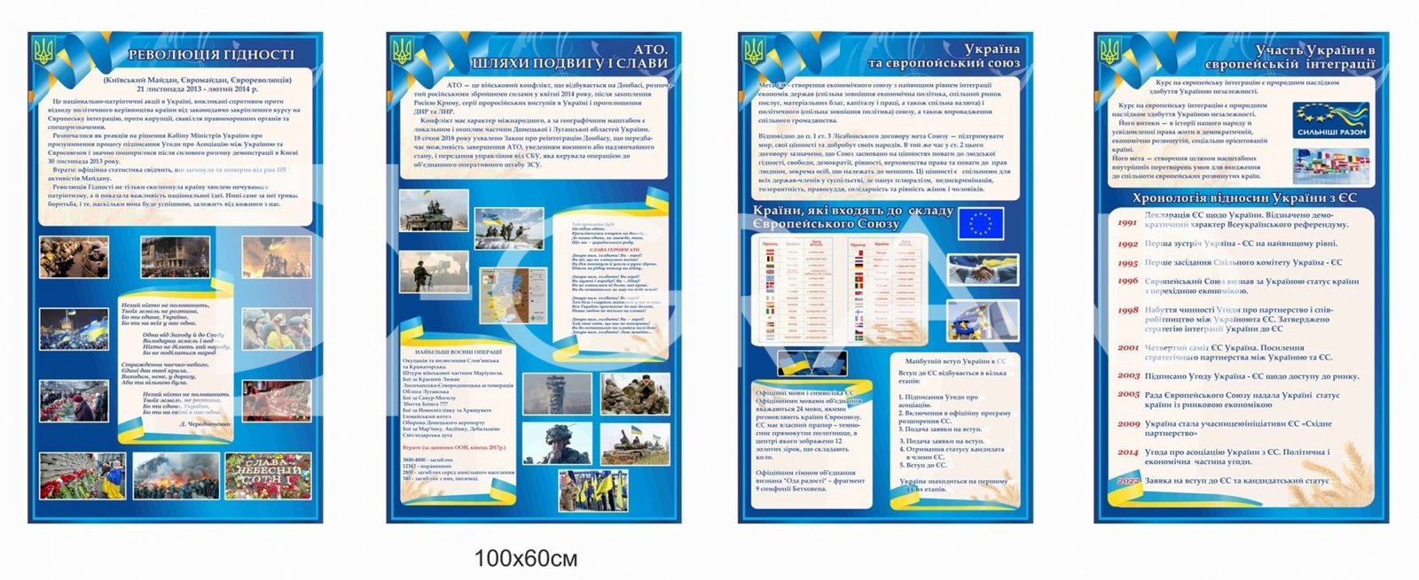 Інформаційні стенди «Революція Гідності. АТО. Євроінтеграція України» призначені для висвітлення ключових подій новітньої історії України та формування громадянської свідомості учнів. Комплект наочно демонструє шлях України до свободи, незалежності та європейських цінностей.