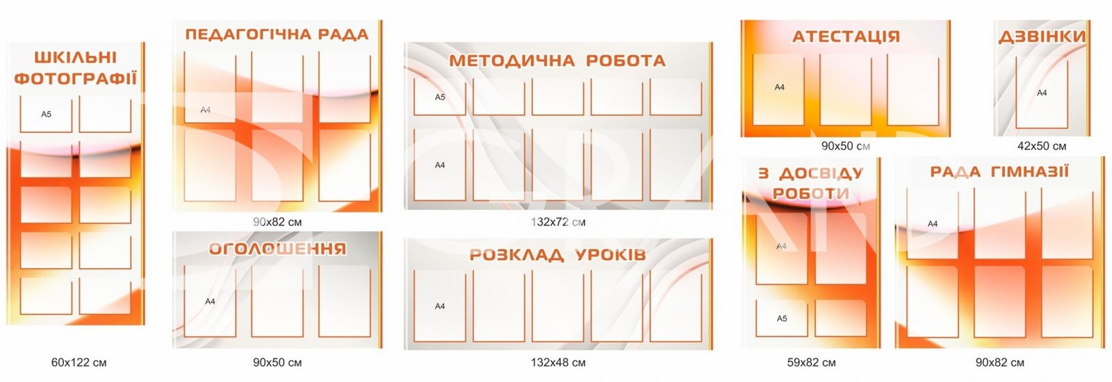 Комплексне та стильне оформлення методичного кабінету — важливий елемент організації ефективної педагогічної діяльності. Команда D-Grand пропонує набір сучасних стендів, які ідеально поєднують естетику та функціональність. У нашій колекції — стенди «Педагогічна рада», «Методична робота», «Атестація», «З досвіду роботи», «Оголошення», «Розклад уроків», «Дзвінки», «Рада гімназії» та «Шкільні фотографії».