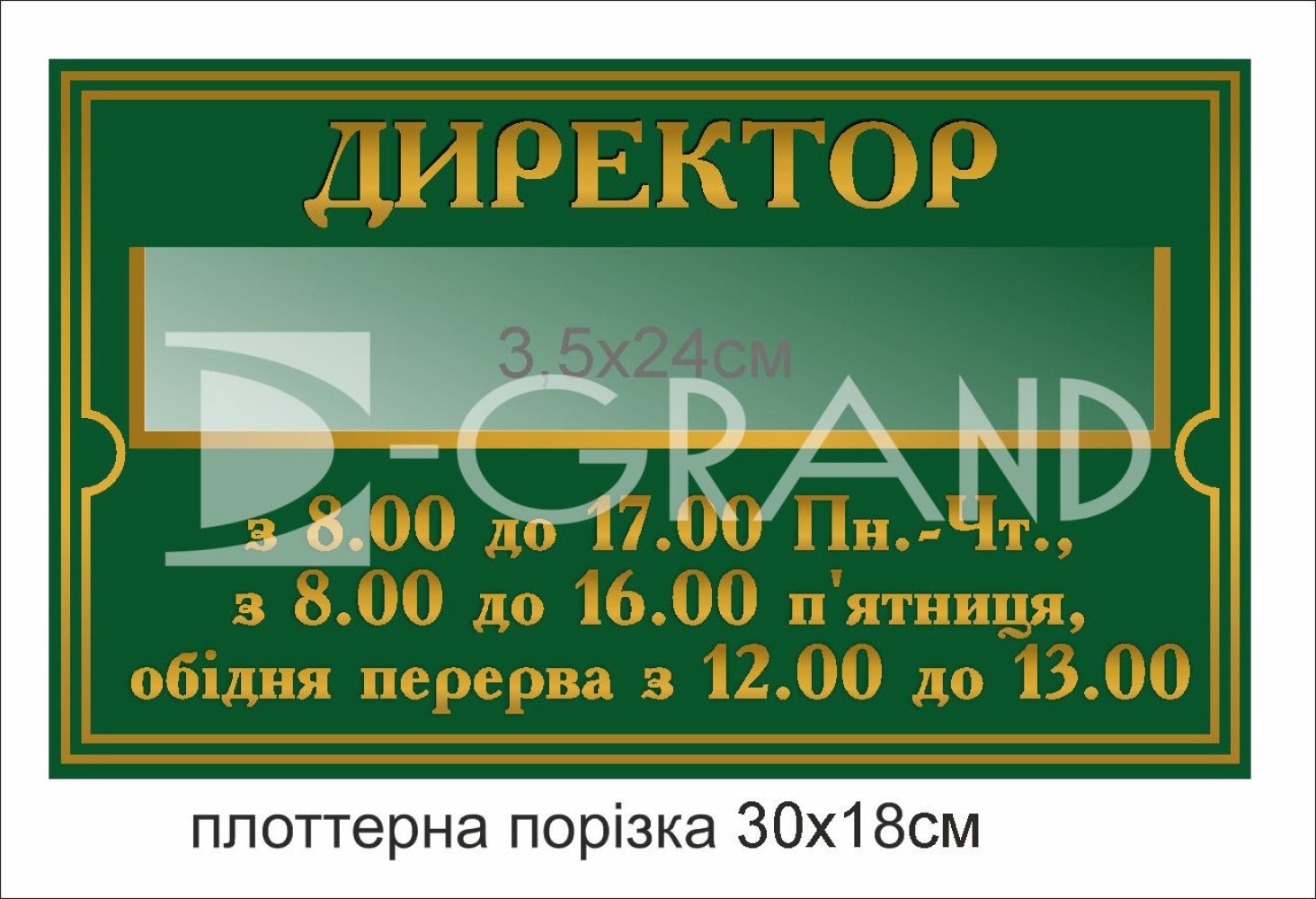 Табличка на кабінет директора з кишенею для ФІО та графіком роботи - ідеальний спосіб додати розкіш та організацію до вашого керівницького приміщення. Виготовлена з високоякісних матеріалів, ця табличка не лише відзначить ваше посадове становище, а й створить враження відповідальності та професіоналізму.