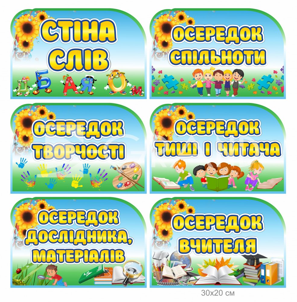 Таблички "Стіна слів, осередок спільноти, осередок творчості, осередок тиші, осередок дослідника, осередок вчителя"