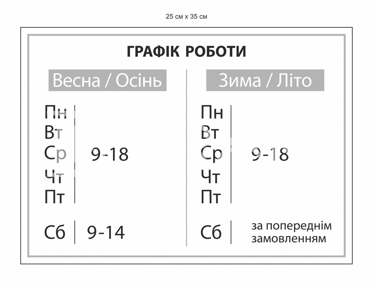 Вивіска "Графік роботи" – це дрібниця, яка свідчить про вашу увагу до деталей та повагу до часу ваших клієнтів. Забезпечте легкий доступ до важливої інформації та підвищіть комфорт для кожного відвідувача.