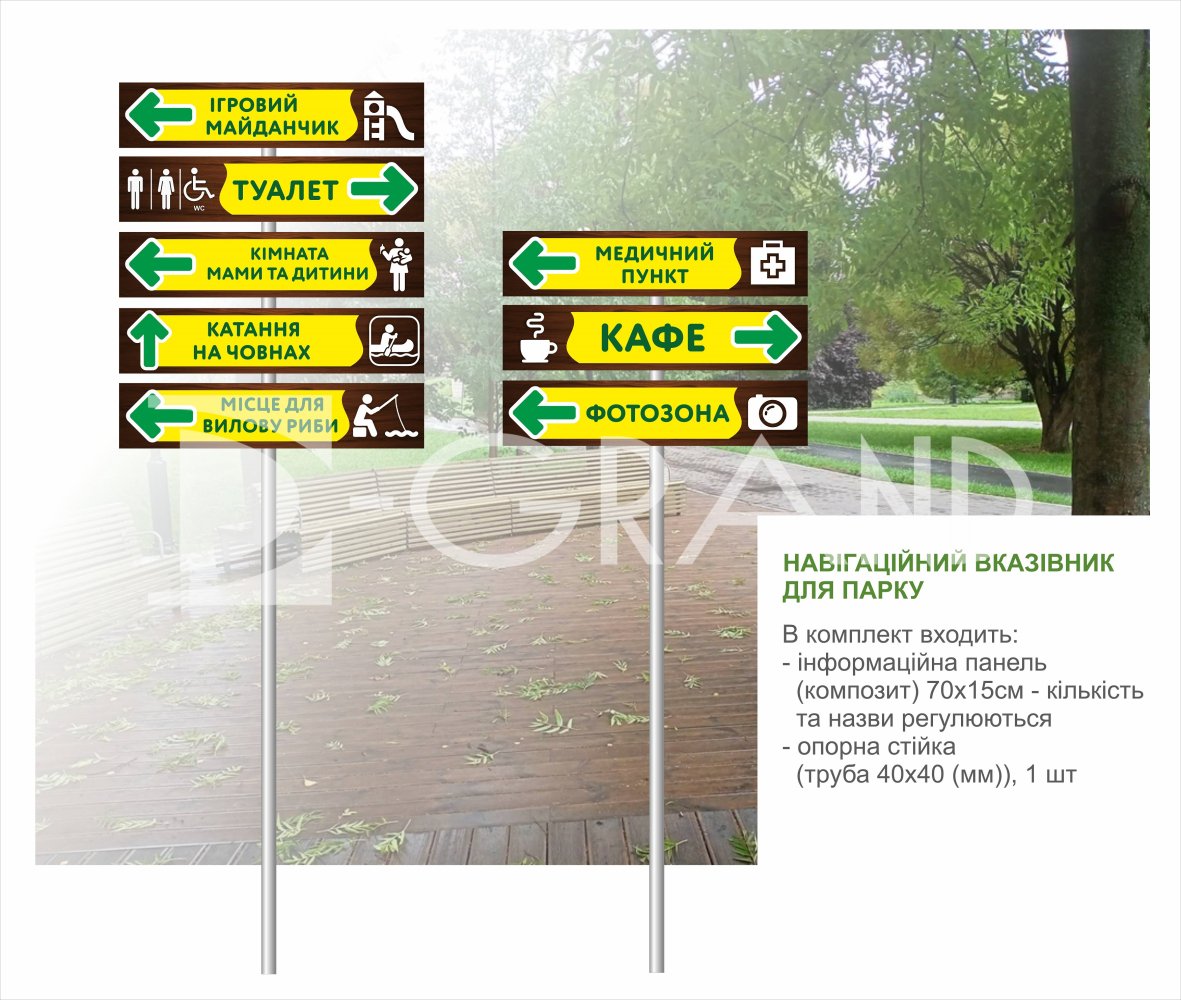 Наш вказівник для парку навігаційного характеру зі стрілочками на D-Grand.com є ідеальним рішенням для поліпшення навігації та орієнтації в парку. Вказівник має видатну особливість - стрілочки, які чітко показують напрямок та шлях до різних об'єктів у парку. Це допомагає відвідувачам легко знайти потрібні місця, визначні об'єкти та маршрути. Наш навігаційний вказівник зі стрілочками має привабливий та сучасний дизайн, що доповнює атмосферу парку та забезпечує легку сприйняття. Замовляйте вказівник для парку навігаційного характеру зі стрілочками на D-Grand.com та допоможіть відвідувачам легко орієнтуватися та насолоджуватися приємним відпочинком.